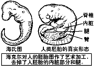中學生物課本上有一張胚胎髮育圖,顯示魚、蠑螈、烏龜、雞、豬、牛、兔、人等動物在胚胎髮育不同階段的側面,其原版收藏在倫敦大學的Bodleian圖書館,它的作者是十九世紀德國 Jena大學的生物學教授海克爾。從這張圖得出的結論是,雖然這些動物成年後形態各不相同,但在胚胎髮育過程中均有一個形態相似的階段,包括人類,各種動物在胚胎髮育的某個階段,其形態會重演一個類似魚的形態,表明它們的共同祖先是水生動物,它們祖先的特徵在胚胎髮育過程中重演了。這就是支持進化論的三大證據之一「胚胎重演律」。